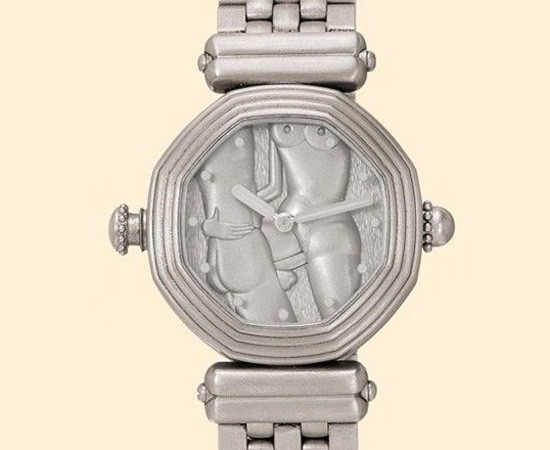 春宫表复苏浪潮中,杰罗尊达Gerald Genta于1993年也推出过一款春宫腕表,该款春宫表画面简洁明了,突显局部“春色”,和白金表身融为一体,有趣的是指针具有夜光功能,在暗处观赏把玩这款腕表,想必别有一番风趣