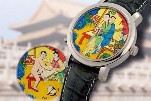 该款2000年左右推出的定制限量版春宫表以白金打造表壳,底盖场景以中国工笔画风描绘,线条柔美,色彩华丽,人物褪去衣衫后更是让人浮想联翩。