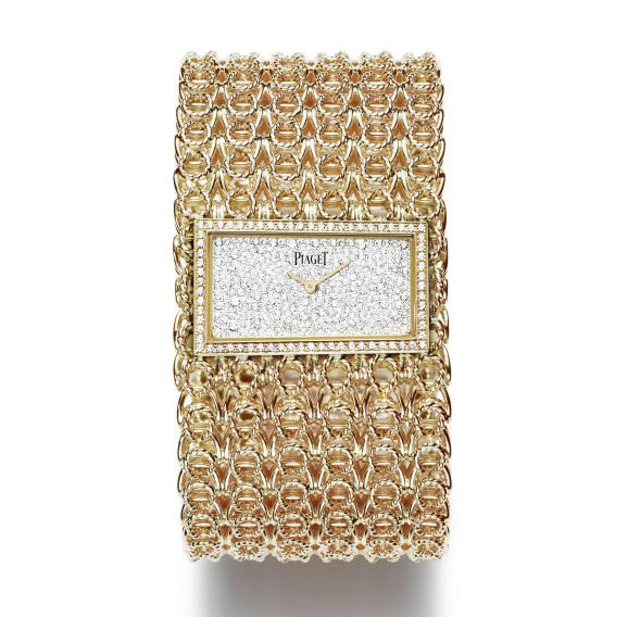 网状的珠宝手镯表的设计灵感来自于伯爵1970年代的作品,在最新推出的系列中,腕表的表盘以红宝石(Ref.G0A38218)、白色珍珠贝母(Ref.G0A38222)以及绿松石(Ref.G0A38217)精心制作而成,与玫瑰金完美搭配。黄金部分被打褶、编织成网状,与高级订制服的时装设计师的工作无异,这枚腕表的精湛工艺展现了伯爵表链工匠具有悠久历史的专业造诣。该款18K 玫瑰金手镯表,镶饰400颗圆形美钻(约重2克拉) ,搭载伯爵56P石英机芯。