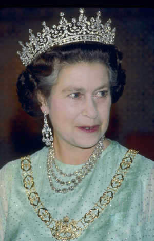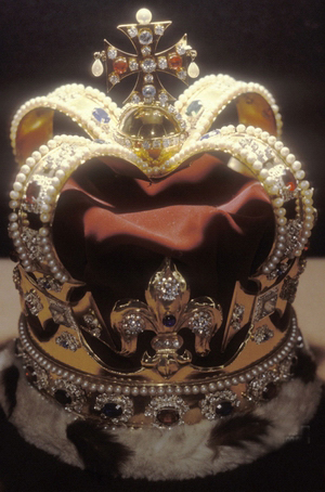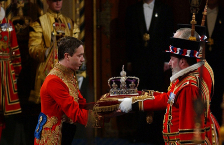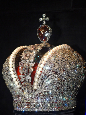 1953年6月2日,盛大的加冕仪式上,伊丽莎白二世是全世界瞩目的焦点,可是比之更为瞩目的是那顶让全世界垂涎欲滴的圣爱德华大王冠,因为它是那样的令人无法割舍,历史上多少的辉煌都与这顶王冠有关。这顶王冠高达31.5厘米,重0.91公斤,雕刻精美的交错百合花底座上托着两个十字架,中间是带着貂皮花边的绿色天鹅绒,金质王冠上镶嵌了多达3000颗各种宝石,其中最灿烂的就是那颗包含着魔鬼的诅咒、重达317克拉的“柯•伊•诺尔二号”,还有重170克拉的黑太子红宝石、圣爱德华蓝宝石。它象征着的是何等的威严和权力。
