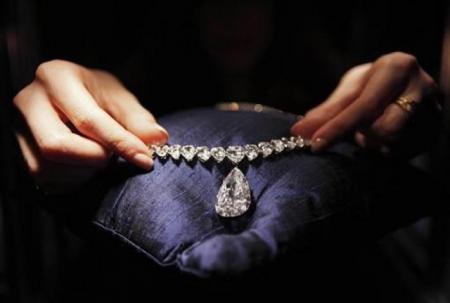 2009年11月13日,瑞士日内瓦,模特展示一颗重62.3克拉、色度为最高级D级的梨形钻石。这颗钻石将于11月18日在佳士得秋季拍卖会上亮相。