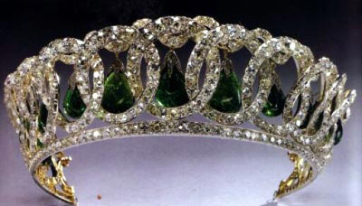 这是伊丽莎白女王珠宝中最著名的一个,它来源于俄罗斯,最早属于俄罗斯的公爵夫人Vladimir,她是梅克伦堡公主,在1917年时,一位年轻的英国贵族将它从圣彼得堡的宫殿里偷了出来。1921年,玛丽王后买下了这顶王冠,伊丽莎白女王有时会用绿宝石来替换镶在王冠里的珍珠。