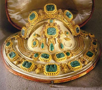 这一套黄金和孔雀石组成的首饰,它包括一顶王冠,两个手镯,一条项链,一个胸针和一对耳环,它曾属于瑞典王后索菲亚,当索菲亚王后去世后,它们被捐赠给了慈善机构。