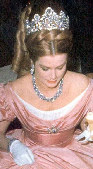 伊朗王后法拉巴列维法拉在和巴列维国王结婚时,佩戴的就是这顶王冠。王冠中央镶嵌着名为Noor-ol-Ain 的粉红钻石,世界上最大的粉红钻石之一,它被其它的黄色,粉红以及其它无色钻石所包围。它现在存于德黑兰的Markazi银行