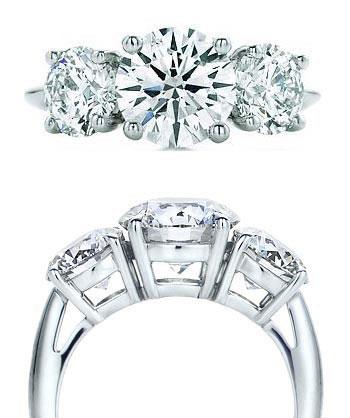 圆形明亮式切割三石钻戒:三颗圆形明亮式切割的钻石在成色,质量与切割比例上都完美匹配。