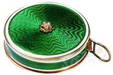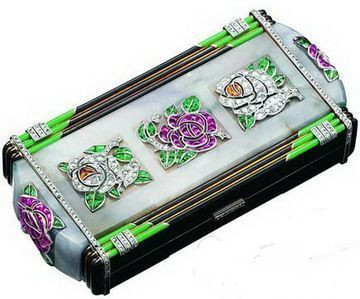 化妆箱内藏镜子、粉盒和其他妆点女士花容的工具。这款饰以由玫瑰切割钻石、绿宝石、红宝石及水滴形黄色蓝宝石组成的玫瑰;边缘由嵌入的黑色和绿色珐琅勾勒,并镶有钻石;镶嵌的底座以黄金和铂金铸造。