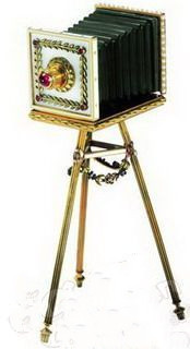 由黄金、彩宝制成的精美珠宝,惟妙惟肖地刻画出了老式相机的造型,趣致又不乏奢华之气。