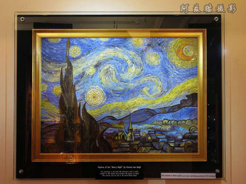 走廊的墙上挂着镶“钻”的梵高名画“星空”,说实话有点俗气,还不如旁边那个钻石骷髅更酷。