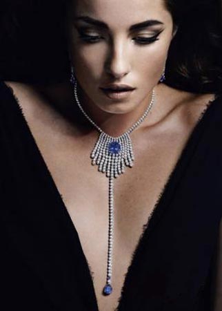 冷冽地以钻石长链垂坠拉长线条并在尾端缀以单颗梨形切割的蓝宝石,令人意乱情迷地凝视着,同系列的耳环低调地呼应着优雅的端庄设计。35克拉的深遂蓝宝石项链散发出典雅及迷人的特质,衬托出优雅女性的无限魅力。透过精巧的装置设计,项链可以围绕颈部配戴,亦可大胆地让它往下垂。