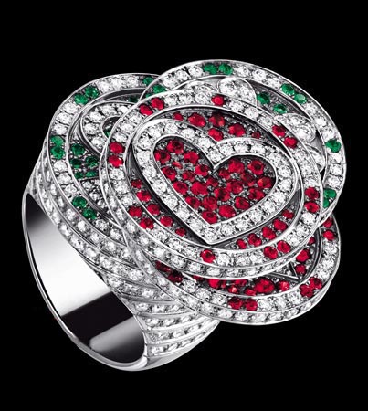 红宝石镶成的红心或JaCK,与祖母绿镶成的梅花层层相叠,转开就像翻开一叠好牌,巧妙精致。 伯爵的设计团队从世界各地寻找不同的灵感,这回把澳门的赌场气氛栩栩如生地描绘在幸运指环中。
