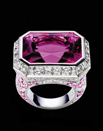 白金指环同样运用了宝石色调与钻石的对比安排,使用单颗重达25克拉且具鲜明粉红色调的电气石,创造出璀璨却柔和的光彩。以粉红色蓝宝石及圆形和公主切割的钻石交错镶饰,使指环更精致夺目。
