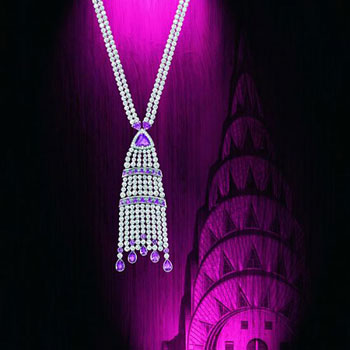 18K白金项链,灵感源自克赖斯勒大厦的建筑结构与曲线,镶嵌462颗圆形美钻 (约重42.5克拉) 、12颗三角形切割钻石 (约重1.6克拉) 及29 粉红蓝宝石 (约重18.77克拉)