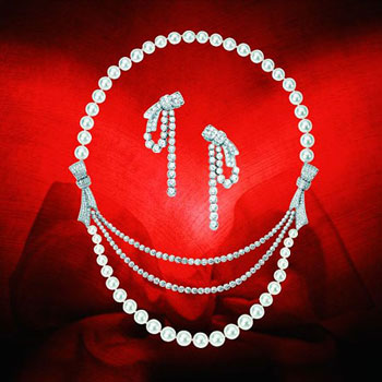18K白金项链,灵感源自蝴蝶结及丝带,镶嵌366颗圆形美钻 (约重16.95克拉) 及43颗珍珠