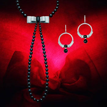18K白金项链,灵感源自蝴蝶结及丝带,镶嵌814颗圆形美钻 (约重9.57克拉) 、81颗黑色尖晶石 (约重714.67克拉) 及单颗黑色电气石 (约重14.58克拉)