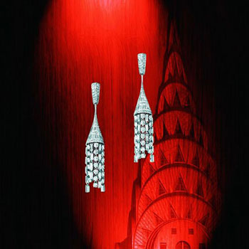 18K白金耳环,灵感源自克赖斯勒大厦的建筑结构与曲线,镶嵌164颗圆形美钻 (约重4.94克拉) 、38颗方形切割钻石 (约重4.55克拉) 及24 梯形切割钻石 (约重3.19克拉)