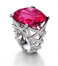 18K白金戒指,灵感源自性感束衣,镶嵌324 颗圆形美钻 (约重5.14克拉) 及单颗红色电气石 (约重56.55克拉)