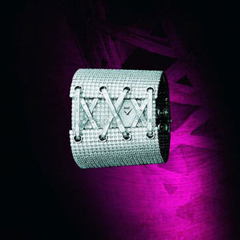 18K白金钻石手镯表,灵感源自性感束衣,表壳、表盘、表带及折迭式表扣镶嵌1576颗圆形美钻 (约重85.8克拉) 及83颗方形切割钻石 (约重7.4克拉) ,搭载伯爵制56P石英机芯