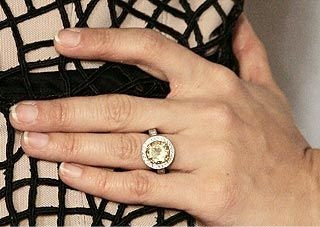 麦克·费希尔在圣诞节向凯莉求婚并奉上闪耀钻石戒指作为礼物,她觉得自己很幸福。戒指由Johnathon Arndt设计,中间一颗超大钻石,并由周围毫无瑕疵的黄色小钻石簇拥着,闪亮至极。