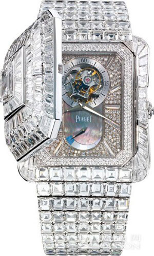 这枚白金腕表共镶嵌1,144颗美钻,表盘正中间为一颗重3 .35克拉祖母绿切割美钻,奢华无比。轻触第一枚钻石按钮,白色珍珠贝母表盘缓缓出现在眼前,设计简约,光泽独特迷人,时间刻度由方形切割美钻镶嵌而成,配备伯爵56P石英机芯。而按下第二枚钻石按钮后,即能欣赏浮动陀飞轮机芯的美妙运作。得益于在超薄机芯领域的深厚功力,双层腕表一直是伯爵的拿手好戏,一枚镶满钻石的双神秘开关设计腕表不仅将伯爵善于结合顶级珠宝与制表工艺的特质发挥得淋漓尽致,更让这枚腕表成为一件独一无二、美不胜收的艺术品,达到登峰造极的完美境界。