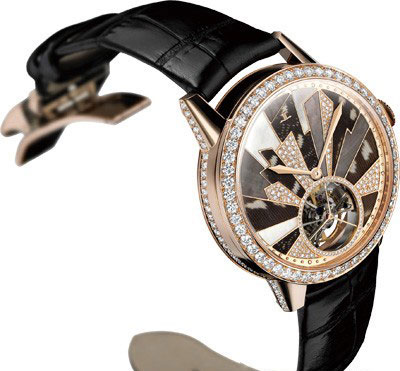 以多种极富女性魅力的元素装饰陀飞轮腕表,是积家这款女装陀飞轮腕表最吸引人眼球之处。这种流光溢彩的组合方式,不仅完美地将陀飞轮装置与精湛的装饰工艺融为一体,更展现出优雅细腻的不凡气度。腕表以18K玫瑰金制造表壳,直径39毫米,更适合女性纤细的手腕。表盘设计灵感来源于装饰艺术风格,珍珠贝母、璀璨美钻和美丽的羽毛拼镶出简洁大气的几何图案,华美中不乏现代女性特立独行的气质。腕表搭载积家978型自动上链机芯,动力储存45小时。绢质表带,搭配镶嵌钻石的金属折叠式表扣。此外,腕表亦有白金版,其中18K玫瑰金款镶嵌315颗重约2.9克拉钻石,白金款镶嵌341颗重约3.2克拉钻石。