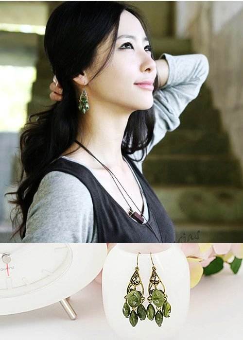 民族风古典串珠耳环,草绿色的串珠,混搭镂空流苏的耳线,衬托出个性美女其独特的气质。