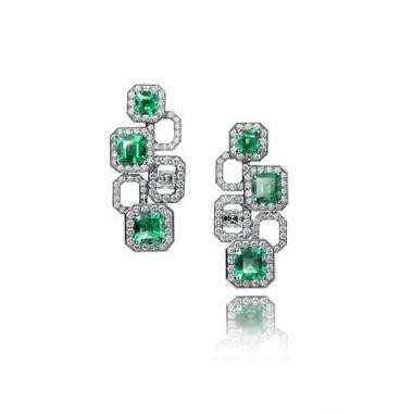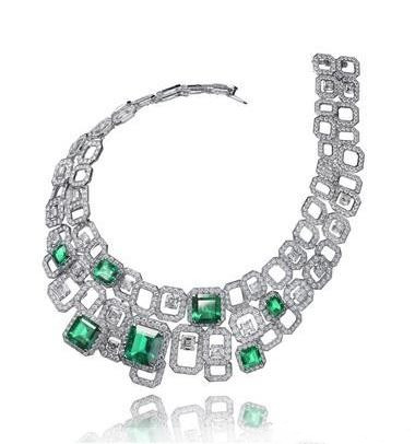 项链和耳环以18K白金镶嵌13颗哥伦比亚祖母绿,91.75克拉,30颗翡翠切工钻石,1235颗钻石83.68克拉。