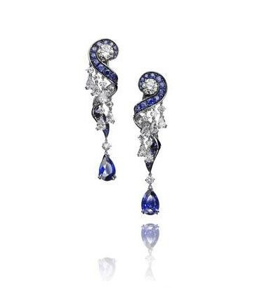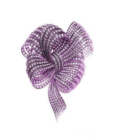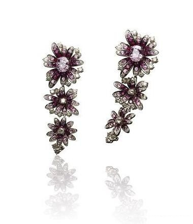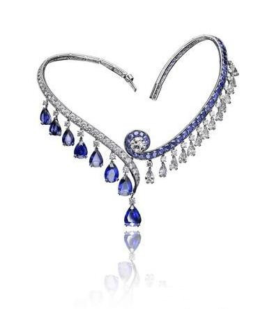 18K白金镶嵌两颗粉红蓝宝石,重10.85克拉,98颗钻石重7.42克拉,128颗红宝石共2.66克拉还有96颗粉红蓝宝石重14.75克拉。