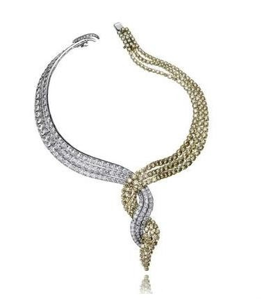以白18K金镶嵌229颗钻石,重44.50克拉和197颗咖色钻石,重60.48克拉。