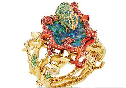 Dior 高级珠宝 18K金镶红色及蓝色蓝宝石、钻石、贵黑欧泊手镯
