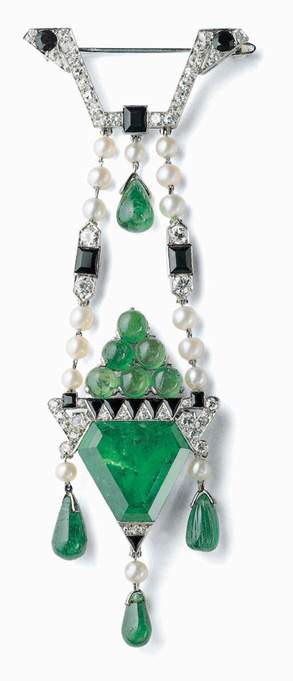弧面型祖母绿,东方珍珠,雕刻珊瑚,红色和黑色珐琅