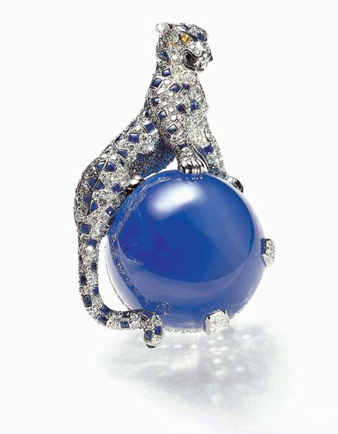 豹子蹲坐在1颗152.35克拉的弧面型克什米尔蓝宝石上