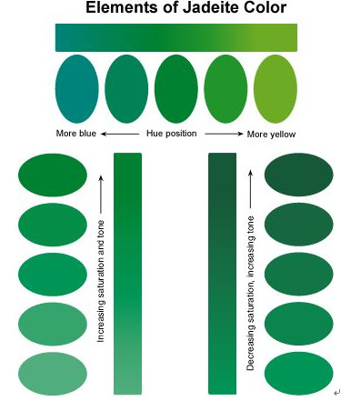 翡翠的颜色千变万化,以浓艳的绿色,亮红色和紫罗兰色为佳,其中以绿色为贵。绿色优劣评价以“浓、阳、俏、正、和”五个字来衡量。其含义是: