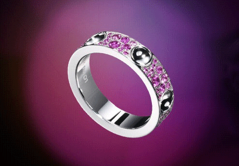 Empreinte系列的设计灵感来自路易威登传统行李箱铆钉上的图案。这款白金戒指镶嵌粉色蓝宝石,精致的做工带来十足女人味。