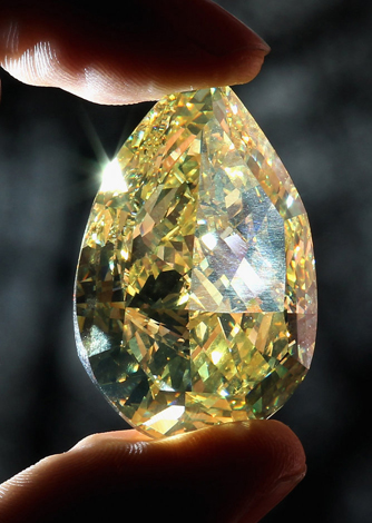 这颗大黄钻名为“太阳之泪”,几乎有女性拇指一般大小。大多数的钻石都是细小而无色的,而镶嵌到珠宝上的钻石也多为5克拉以下,而有色钻石一般是其中含有其他物质,或者结构有缺陷造成的,比如含少量硼的蓝钻、受辐射产生的绿钻,及含氮的黄钻,但如此颜色鲜明的钻石却非常罕见。