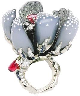 这款造型夸张的太空感灰色大花瓣戒指,点缀了碎钻和红宝石,让你在举手投足间都是众人眼中的焦点。