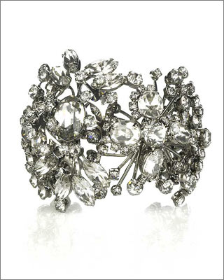 Erickson Beamon用金属和宝石制造了一个让人啧啧称奇的手镯造型,没有丝毫规律的装饰布置和自由不羁的形状让这款手镯变成了一种只可意会的概念,使得附着在漆皮上的这些装饰物透着曼妙和奇异。