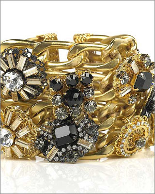Erickson Beamon手镯在金色的锁链轻轻的缀着施华洛士奇水晶和黑玉装饰,一种顶级的华贵和奢侈在闪亮的光芒和剔透的色彩中显露出来,利用繁杂的造型和夺目的色彩交织出使人惊艳的美丽。