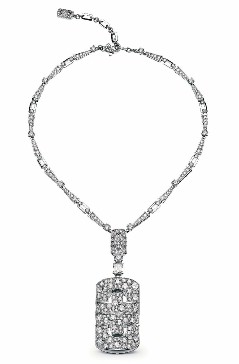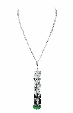 美洲豹系列几乎可与品牌画上等号,最有名的莫过于温莎公爵夫人拥有的美洲豹胸针。美洲豹珠宝最早出现在1917年,当时是以明亮式切割圆钻和黑玛瑙塑出整只美洲豹,做为小化妆箱上的装饰。左图这条豹头项链,挂环可开启,共有1,190颗钻石和17颗绿宝石。