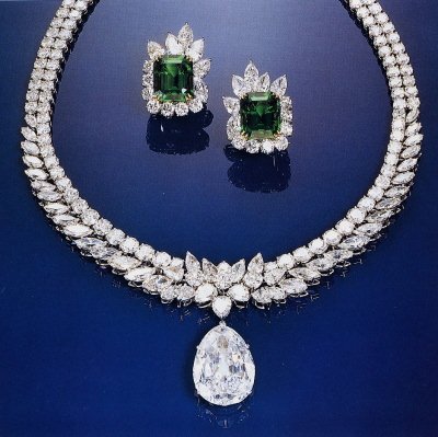 三祖母绿切割,重达42.95,30.90和22.88克拉(4.58克),全部是D色无瑕的清晰度,原石重307.30克拉(61.46克),温斯顿曾在1972年购买的。