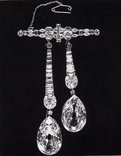 重量为:33.70和23.65克拉,由温斯顿再切割为31.01和18.85克拉,两个石头不分伯仲,温斯顿买了他们,重新设计,决定略提高其清晰度,切割为古董的梨形