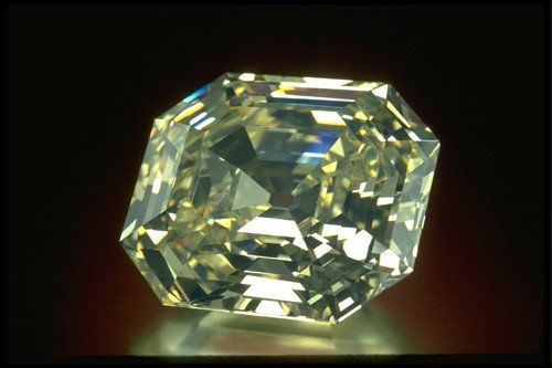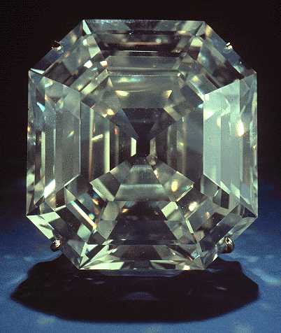 产地及其它信息: 钻石的源产地不很确定,可能是巴西。在获得目前的质量之前,钻石曾被切磨成150克拉的垫型。它的净度为Flawless,颜色略显淡黄,形状为不规则的八边祖母绿型。在紫外灯下有强烈的荧光现象。1951年哈利·温斯顿(Harry Winston)将其买下,1963华盛顿的史密森学会(Smithsonian Institute)获得此钻直至今天。