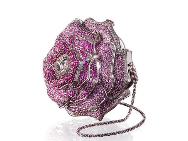 Leiber雷伯的玫瑰花手袋绝对无与伦比,18K白金包身表面共镶嵌了1016颗钻石、1169颗粉色蓝宝石和800颗碧玺。带上这样“一枝”珠宝玫瑰,让人想忽视都做不到!
