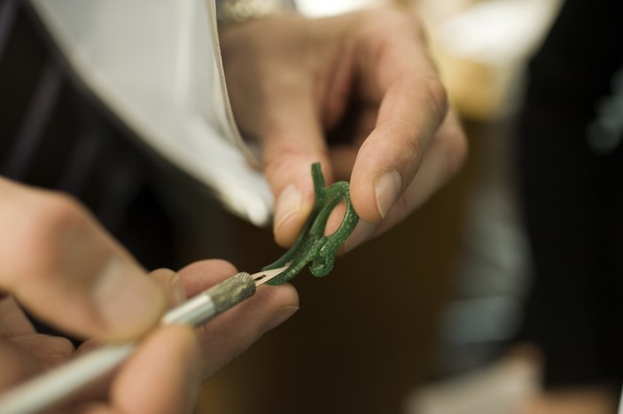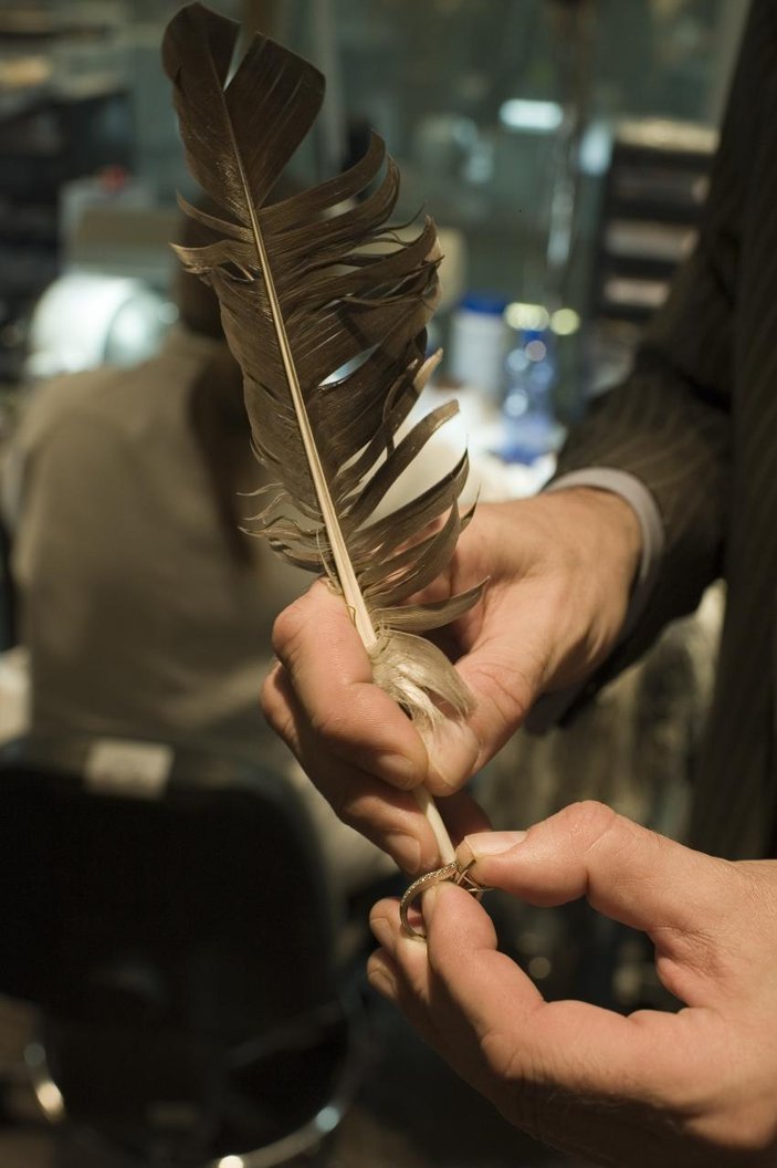 (用坚硬的鹅毛梗为特别细小的金属边缘进行抛光,是卡地亚独创的古老技艺之一)