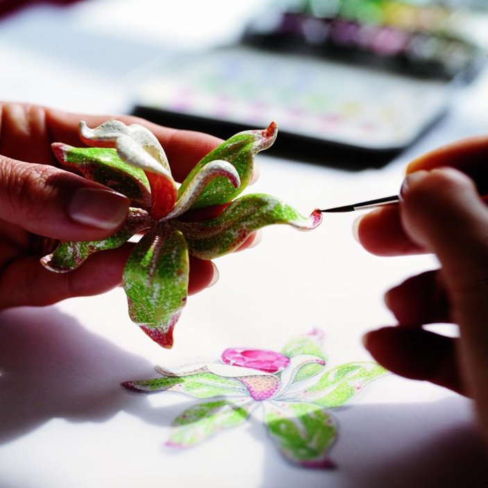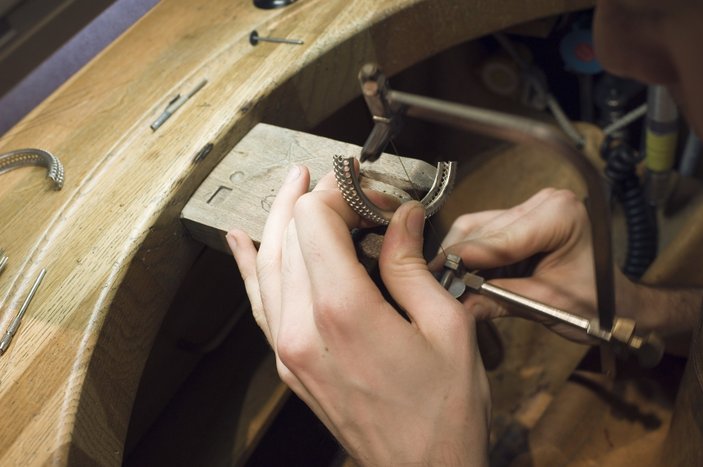 珠宝全手工的制作过程中,少数涉及机器的部分在于切割钻石。由于钻石是最坚硬的宝石,因此只能用同样坚硬的钻石来进行切割:先将其固定在以钻石制成的机器上,调整倾斜角度、高度,来达到所需的效果。而钟表制作中,涉及机器的部分则更多在于以电脑计算机芯与珠宝的融合,将其完美地呈现在珠宝设计中,寻找理性与感性的平衡。在继承传统手工艺的基础上,珠宝工匠们也在创新的设计上不断研发适合的新技艺,世代传承并推进发展的手工艺造就了卡地亚的独特风格。