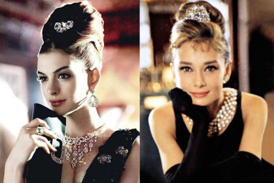 《蒂凡尼的早餐》是赫本献上的另一个荧幕经典形象,她饰演的是一个崇拜物质金钱一心期望吊得金龟婿的拜金女霍莉,但这样的拜金女在赫本的演绎下又多了一份天真善良。不仅是这个角色,《蒂凡尼的早餐》还成就了赫本的优雅小黑裙,高耸花苞头、粗眉大眼、黑裙黑手套,这几乎成了赫本的标志。这个经典形象,海瑟薇也演绎过,同样的妆容、同样的发式,只是她比赫本多了一丝性感和俏皮。