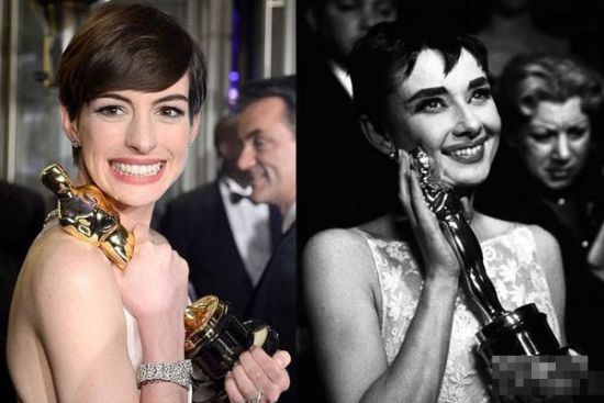 1954年的奥斯卡,赫本凭借《罗马假日》获得了最佳女主角,当时她身穿一条白色蕾丝绣花连衣裙,犹如降落凡间的精灵,这件半露背式连衣裙前胸平领、后背用丝带环绕,被赫本称为“幸运连衣裙”。巧的是今年的奥斯卡,海瑟薇选择的Prada礼服跟赫本的这件有着惊人的相似,她在斩获最佳女配角后亲吻奖杯的瞬间也像极了赫本。