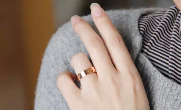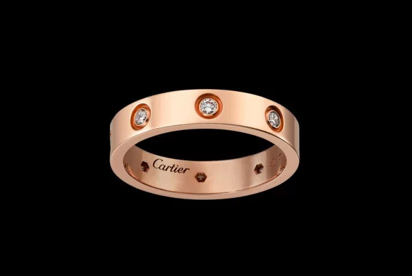18K玫瑰金婚戒,镶嵌8颗钻石。宽4毫米