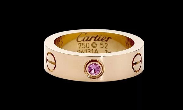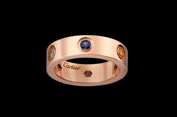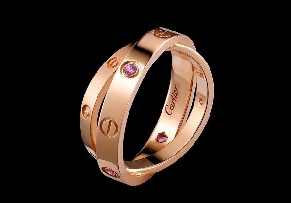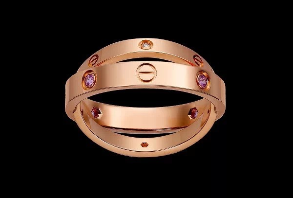 Love戒指,18K玫瑰金,镶嵌4颗粉红色蓝宝石和2颗圆形明亮式切割钻石。