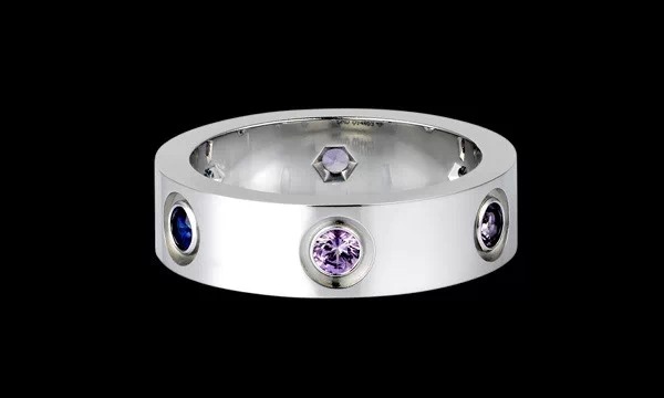 白18K金戒指,镶嵌6颗彩色宝石: 紫色尖晶石,蓝色和粉红色蓝宝石,紫水晶,海蓝宝石。 尺寸从44到60毫米。