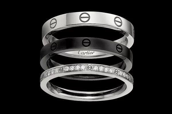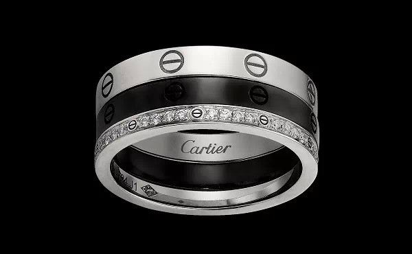 三环戒指:一个白18K金环,一个黑色精密陶瓷环和一个镶嵌钻石的白18K金环。
